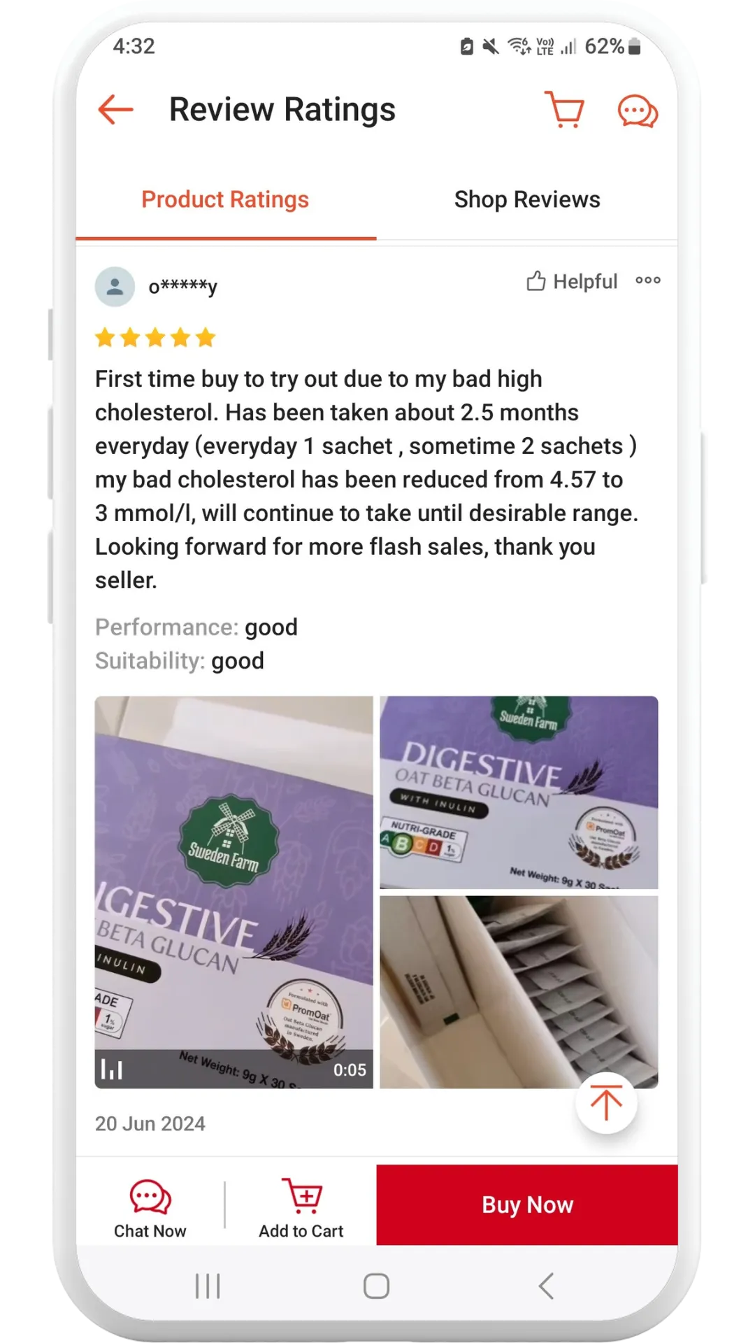 First time buy to try out due to my bad high cholesterol. Has been taking about 2.5months everyday (everyday 1 sachet, sometimes 2 sachets) My bad cholesterol has been reduced from 4.57 to 3 mmol/l will continue to take until desirable range.